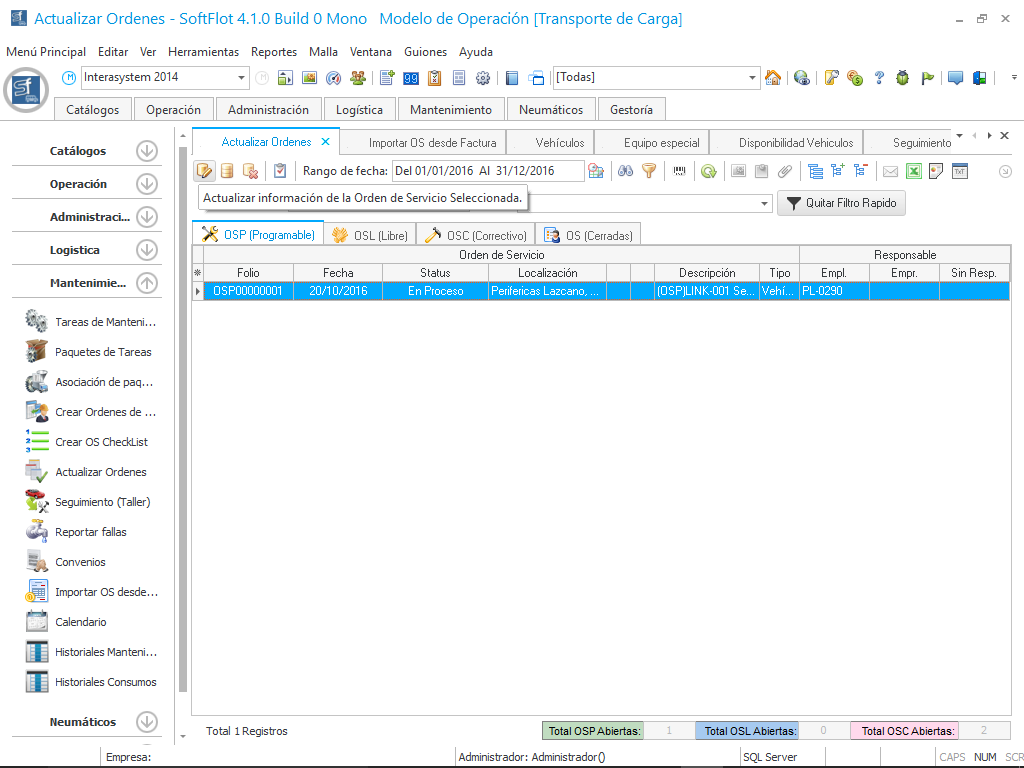 En esta ventana podemos visualizar las ordenes de servicio ya sea OSP, OSL u OSC; además nos muestra las Ordenes de Servicio enviadas al módulo Seguimiento (Taller). Para actualizar una OS, debemos de seleccionar el folio de la OS y posteriormente dar clic en el botón , como se muestra en la siguiente ventana.