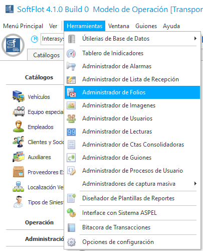 Por medio de esta herramienta, podemos modificar tanto el prefijo de los folios, la longitud de caracteres e incluso si deseamos reiniciar los folios mismos. Para abrir esta opción, debemos de ir al menú [Herramientas \ Administrador de Folios] como se muestra a continuación.