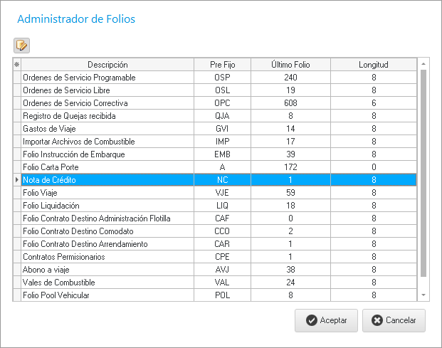 Al hacer clic nos, se abre la siguiente ventana en la cual nos muestra los diferentes folios que maneja el SoftFlot en cada sección del mismo. Para modificar las características del folio, debemos de seleccionarlo en la malla de datos y hacer clic en el botón como se muestra en la siguiente imagen.