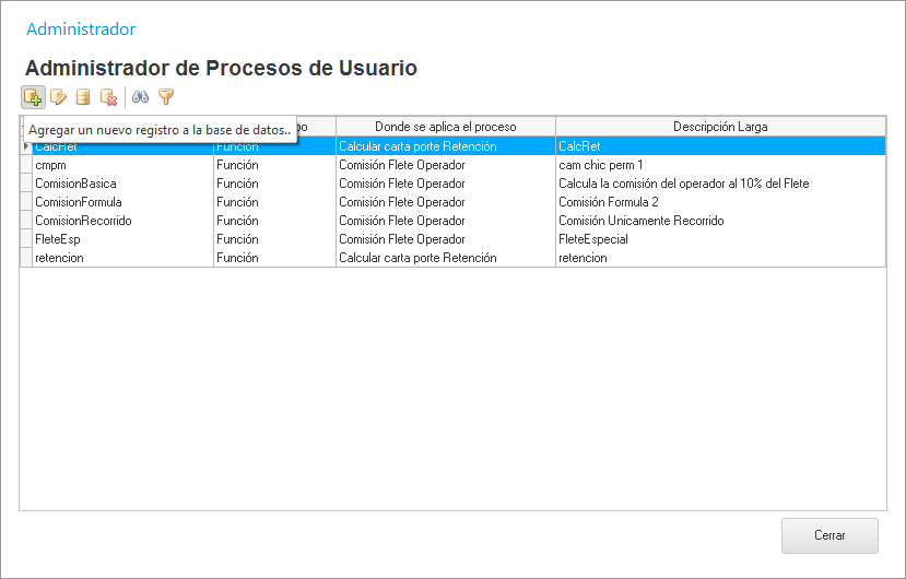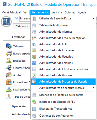 En esta sección podemos definir procesos y funciones las cuales podemos utilizar en Logística. Para abrir esta opción, debemos de ir al menú [Herramientas \ Administrador de Procesos de Usuario] como se muestra a continuación.