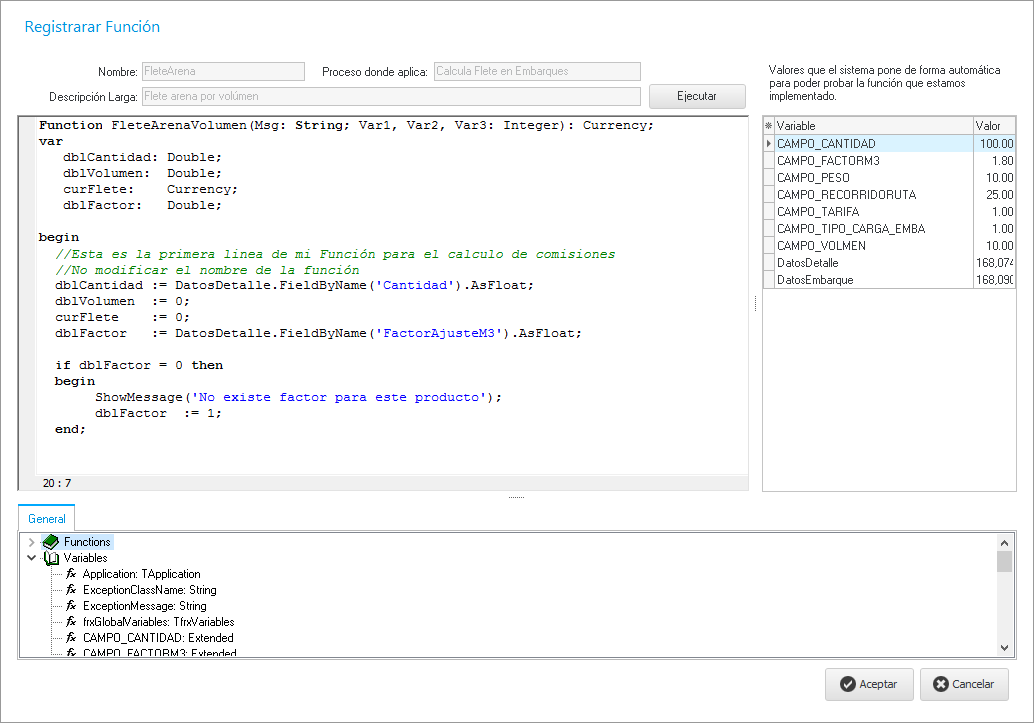 Después de ingresar la información previa, hacemos clic en Aceptar e iniciar función; de esta manera nos muestra la siguiente ventana en la cual debemos de programar dicha función con ayuda de las opciones en la parte inferior (Functions, Variables).
