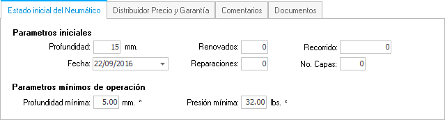 Al hacer clic nos muestra la siguiente ventana en donde ingresaremos las características del neumático, la información de almacenaje, distribuidor entre otros.