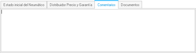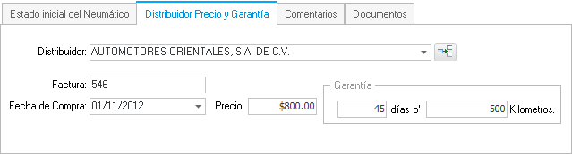 En esta pestaña podemos seleccionar el distribuidor si lo tenemos dado de alta en el Catálogo de Proveedores Externos; y la información del neumático como factura, fecha de compra, precio y garantía, ya sea por días o por kilometraje.