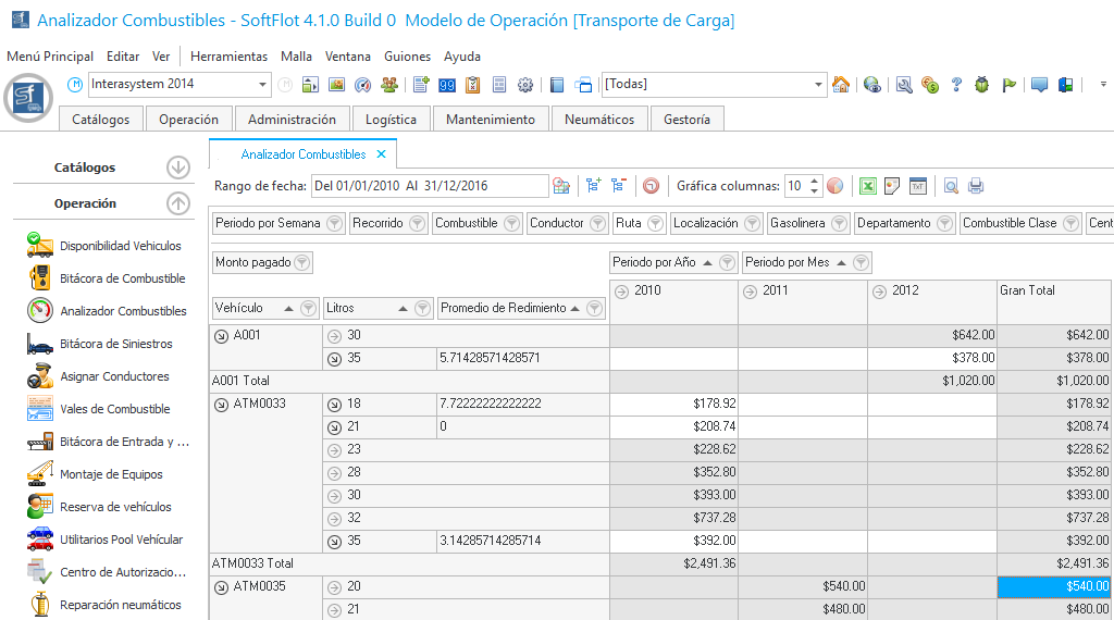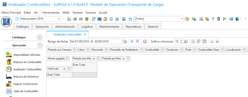 Por medio del Analizador de Combustible, podemos consultar la información de manera más precisa por medio de varios filtros tales como: vehículo, conductor, ruta localización, gasolinera; y mostrarnos diferente información como monto pagado, litros (combustible), recorrido, etc.