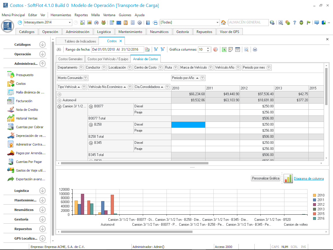 Aquí tenemos campos móviles para obtener el máximo de información y con el orden o acomodo que requerimos consultar. De igual manera, necesitamos ingresar un rango de fechas para consultar utilizando el botón y, al igual que el Analizador de Combustible, nos permite manejar campos para filtrar la información como se muestra en la siguiente imagen con el ejemplo de [Tipo de Vehículo \ No. Económico \ Cta. Consolidadora] y el costo se muestra [Periodo por Año].