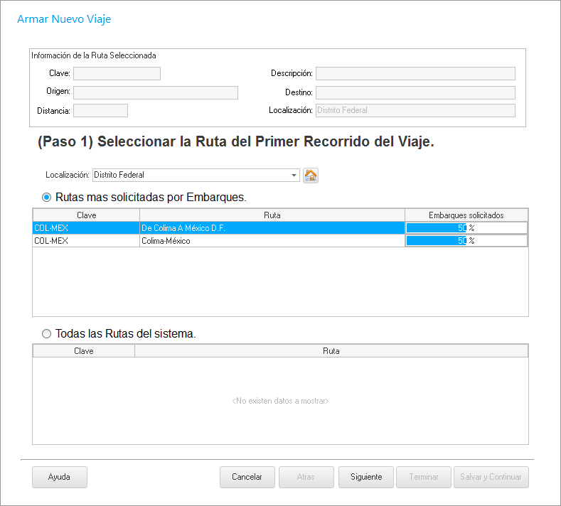 Para armar un viaje debemos dar clic en el botón para abrir la siguiente ventana en donde seleccionaremos la ruta para el viaje.