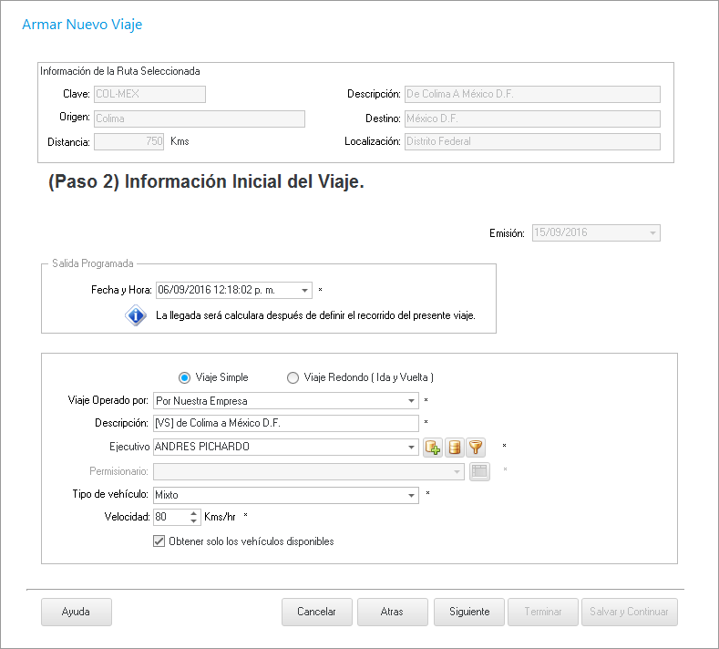 Damos clic en Siguiente y nos muestra la ventana en donde debemos seleccionar la fecha y hora programada de salida, si es viaje de ida y vuelta, quien opera el viaje (nuestra empresa o un permisionario), ejecutivo quien autoriza la salida, tipo de vehículo, velocidad del vehículo en el viaje, y que en la siguiente ventana solo nos muestre los vehículos disponibles.