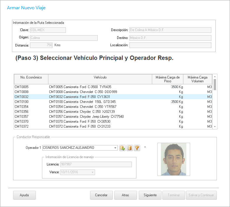 Damos clic en Siguiente y nos muestra la siguiente ventana en donde debemos seleccionar el vehículo y el operador.