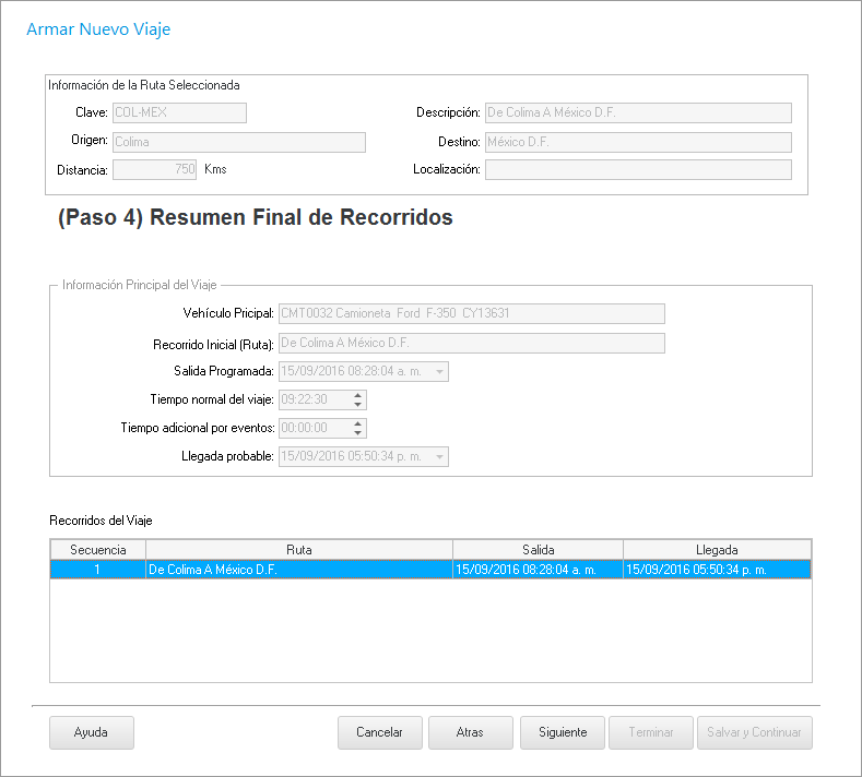 Damos clic en Siguiente y nos muestra la ventana en donde nos muestra un resumen de la información del viaje.