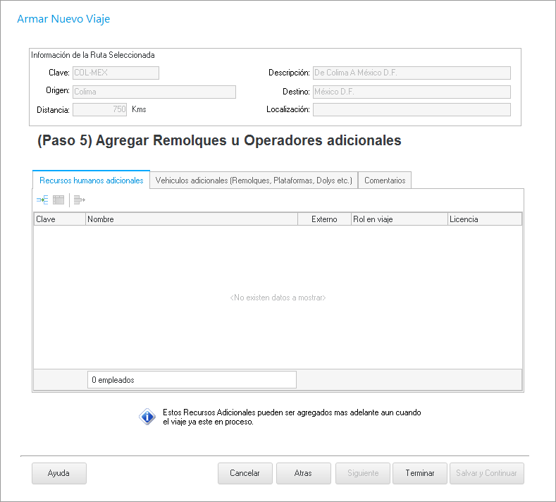 Damos clic en Siguiente y nos muestra la ventana donde ingresaremos, si es necesario, un equipo adicional o recursos humanos como un segundo operador o un ayudante.