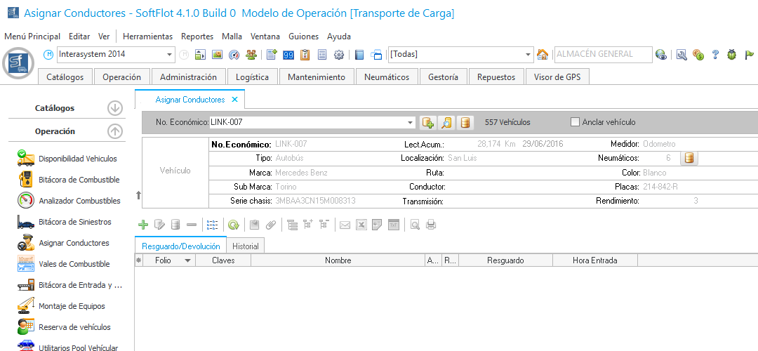 Utilizamos este módulo para llevar el control de quien tiene asignado cada vehículo en la empresa ademas se registra en un resguardo el estado del vehículo de cuando se recibió, inclusive se pueden guardar fotografías en varios puntos del vehículo y también se puede detallar el equipamiento como puede ser auto estéreo, bocinas, faros de Niebla, tumba burros, porta equipaje etc.