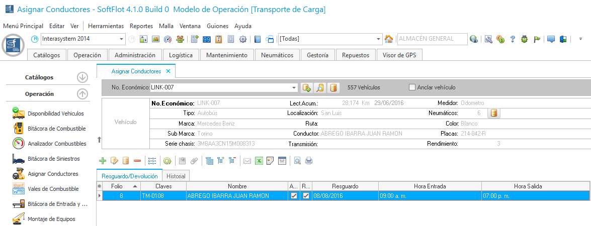 Para asignar un conductor, seleccionamos un vehículo en la sección y damos clic en el botón para realizar el movimiento de resguardo como se muestra en la imagen.