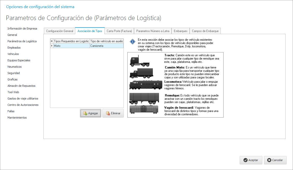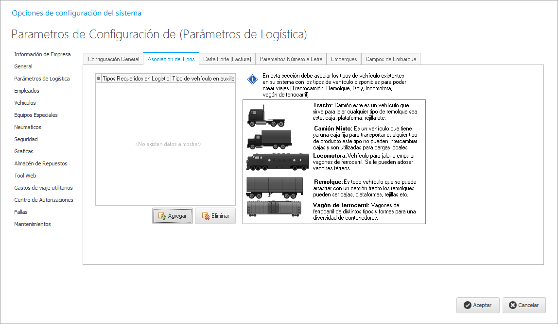 logística, solo se pueden modificar el tipo de vehículos registrados