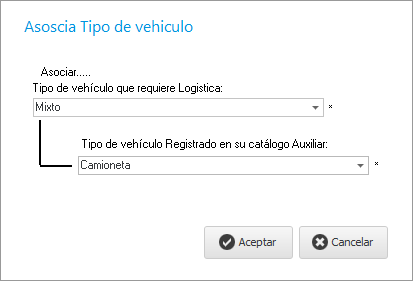 Al hacer clic nos muestra la siguiente ventana en la cual seleccionaremos primero el tipo de vehículo que nos solicita logística y después el tipo de vehículo que se encuentra en nuestro catálogo; de tal manera que al generar un viaje y seleccionar tipo Mixto, en este caso, como vehículo nos muestre todos los vehículos tipo Camioneta que se encuentren Activos y Disponibles en nuestro Catálogo de vehículos.