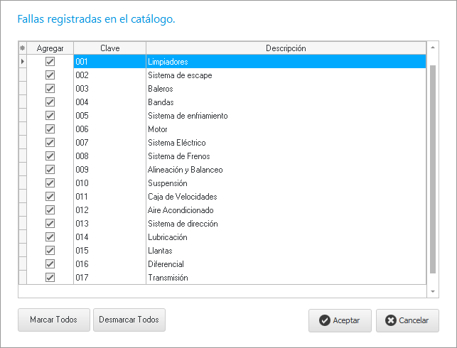 Al hacer clic, nos muestra la siguiente ventana en donde seleccionamos las fallas creadas previamente en el Catálogo de Auxiliares.