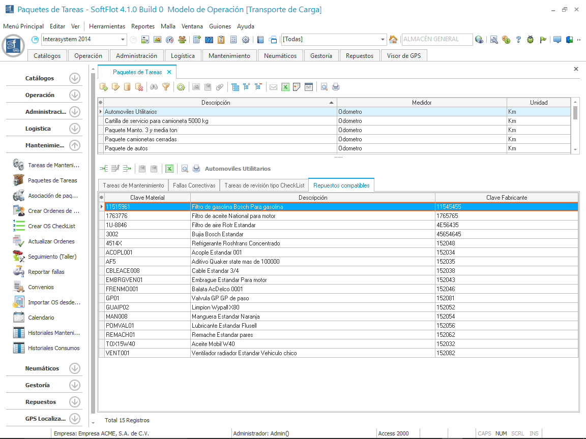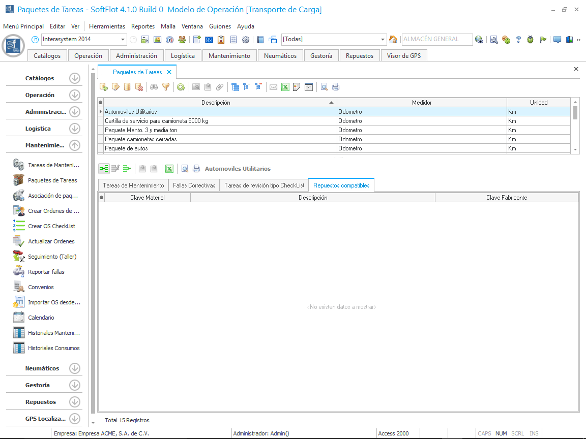 Al dar clic en Aceptar, nos muestra la información actualizad en la malla principal de datos; de esta manera al hacer una Orden de Servicio al vehículo o equipo asociado a este Paquete de tareas, al utilizar los materiales de nuestro almacén podemos filtrarlos por este concepto.