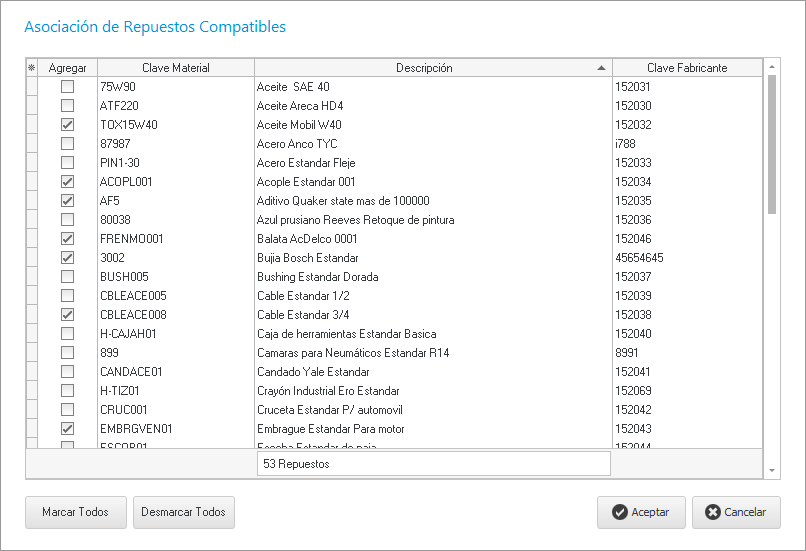 Al hacer clic, nos muestra la siguiente ventana en donde seleccionamos los repuestos, ya sea de nuestro catálogo de Repuestos (si tiene el complemento) o de sus Recursos Materiales.