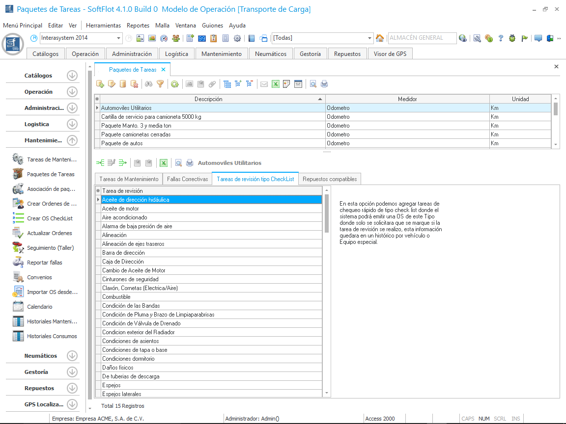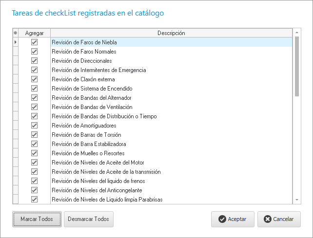 Al hacer clic, nos muestra la siguiente ventana en donde seleccionamos las tareas de checklist creadas previamente en el Catálogo de Auxiliares.