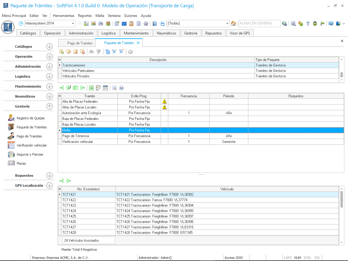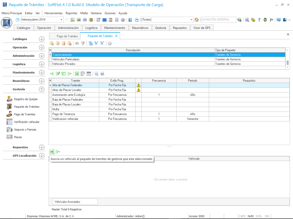 Una vez creado los trámites al paquete, debemos de asociar los vehículos a este. Para asociar los vehículos debemos de hacer clic en el botón en la parte inferior de la malla principal como se muestra en la siguiente imagen.