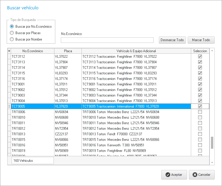 Al hacer clic en Aceptar nos muestra los vehículos asociados en la malla principal del módulo.
