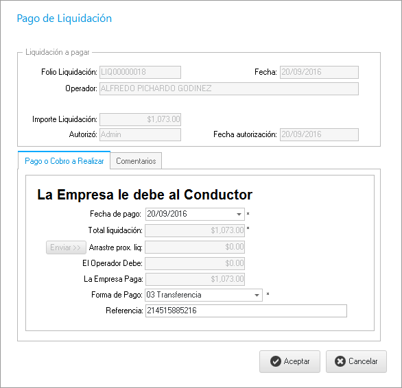 Para realizar el pago al conductor, debemos de seleccionar el botón el cual nos abre la siguiente ventana en donde únicamente seleccionaremos el Método de pago y una referencia.