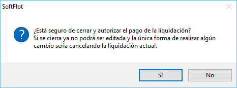 Al dar clic en el botón "Cerrar y Autorizar Liquidación para Pago", nos muestra la siguiente leyenda advirtiendo que al hacer esto ya no podrá ser modificado.