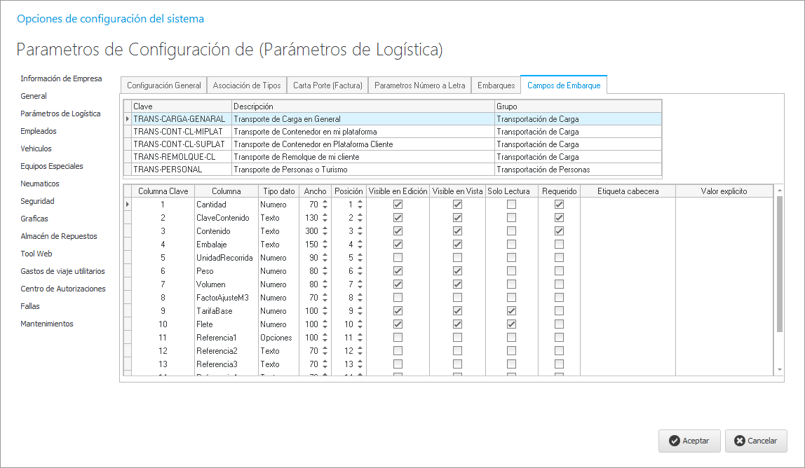 Al crear una nueva ruta nos solicita seleccionar un tipo de carga, es aquí en donde definimos estos tipos de carga como ancho de información, posición, si es visible, editable, requerido, etc.