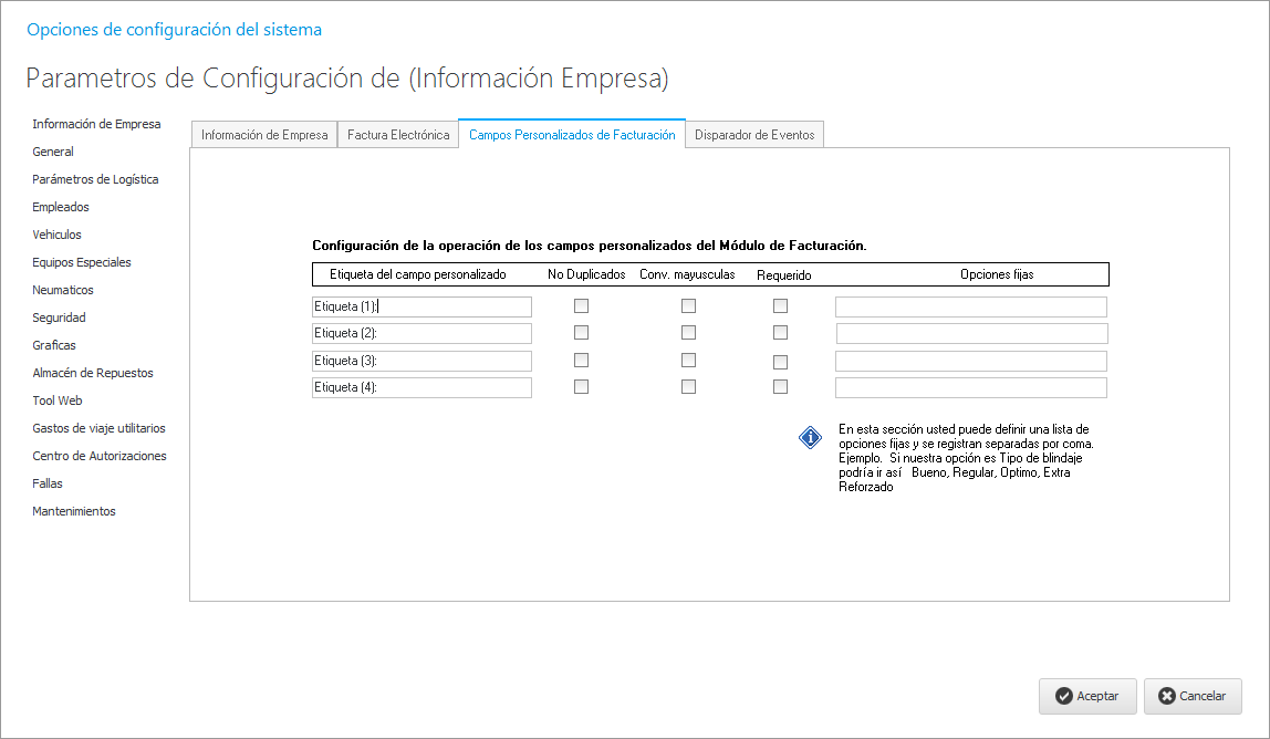 En esta pestaña podemos definir los campos personalizados que podemos agregar al momento de realizar una factura y definir si el campo es requerido, admite duplicados o las convierte a mayúsculas.