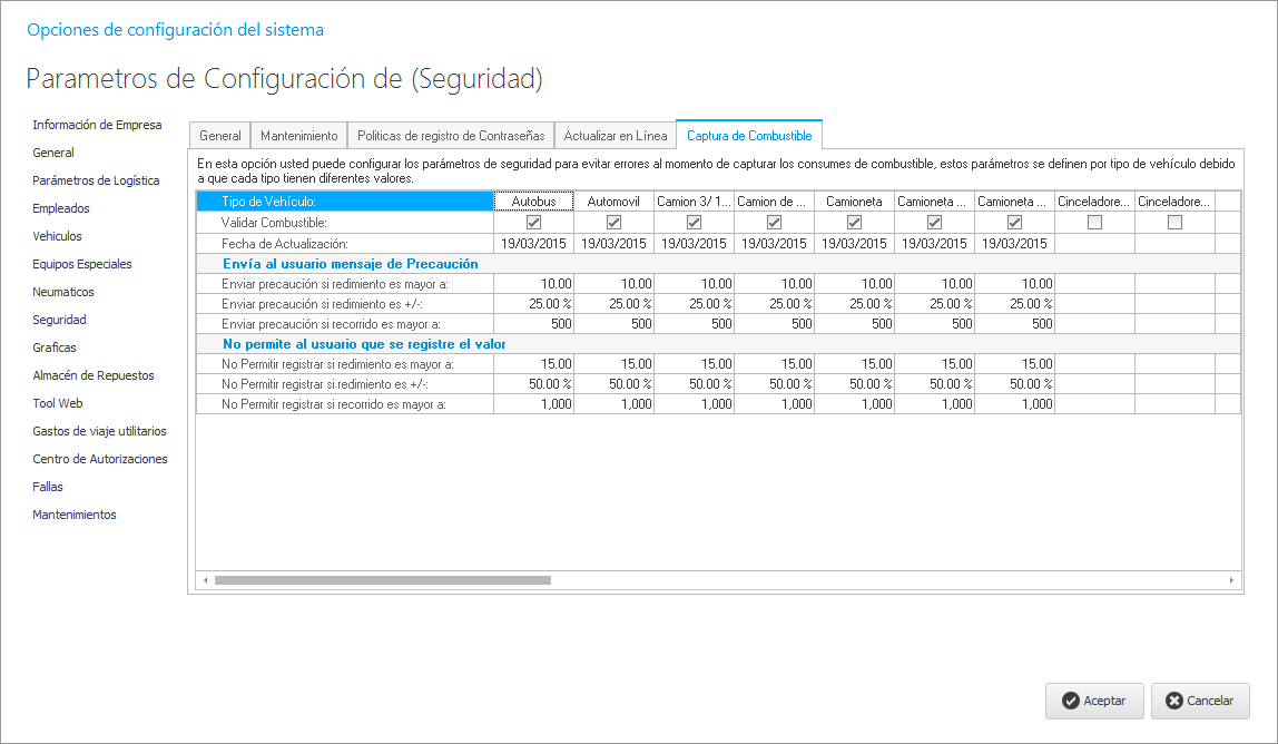 En esta pestaña, como lo dice la leyenda de la ventana, podemos configurar los parámetros de carga de combustible para evitar errores al momento de realizar estas mismas. De esta manera podemos llevar un mejor control en el rendimiento del vehículo, recorrido, etc.