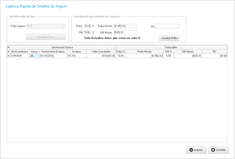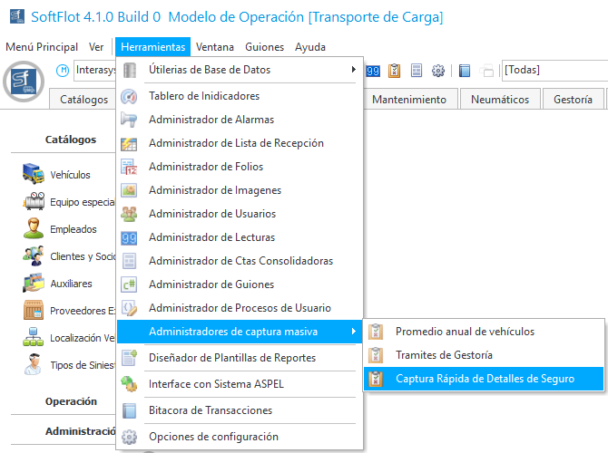 Con la ayuda de esta herramienta, podemos actualizar de manera masiva el detalle de la información de los seguros. Para abrir esta opción, debemos de ir al menú [Herramientas \ Administrador de captura masiva \ Captura Rápida de Detalles de Seguro] como se muestra a continuación.