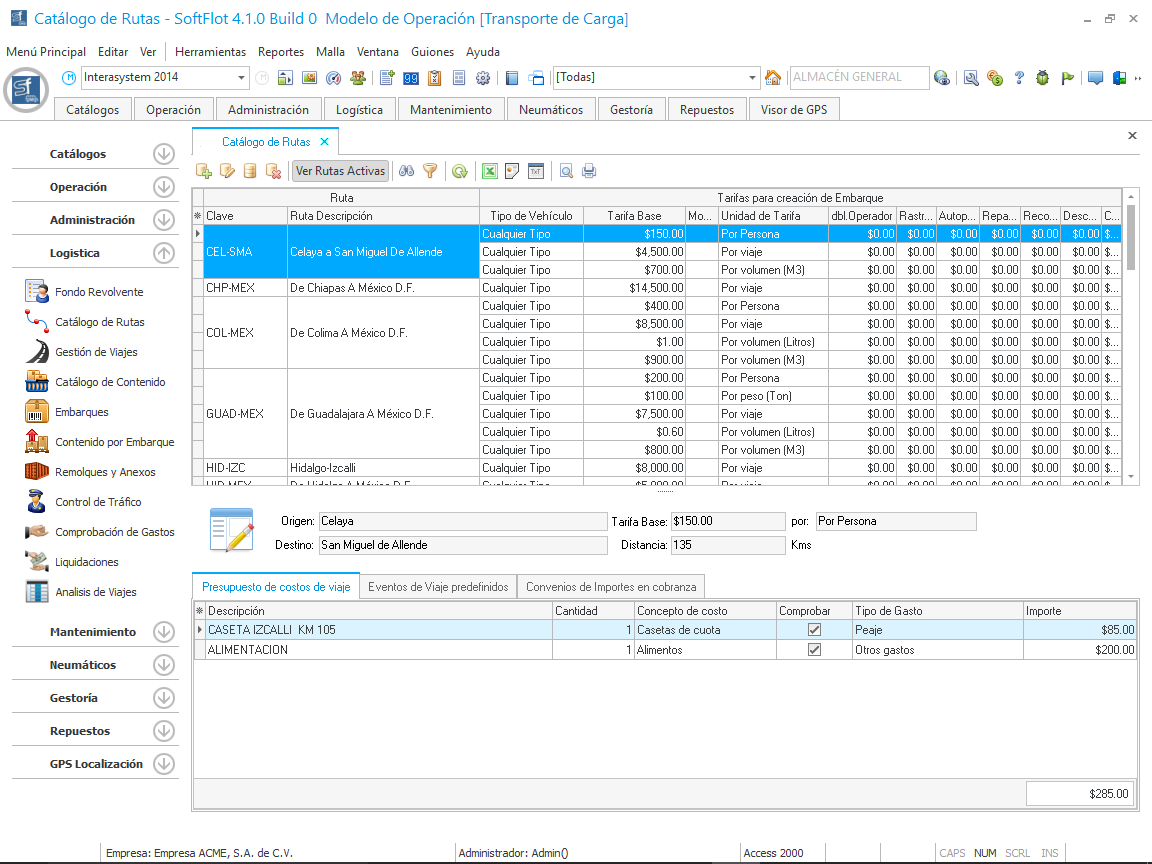 Logística es donde los usuarios registran todo lo que tenga que ver con la transportación de cualquier tipo de producto de un lugar a otro, cobrando un flete al cliente por este servicio, el inicio del proceso esta en la creación de una Ruta, esta contiene la información principal como es (Clave, Origen, Destino, Tarifa e información de gastos adicionales del viaje) también en la ruta podemos personalizar cada concepto en la tarifa, asociándolo con un cliente y así crear lo que se llama convenios.