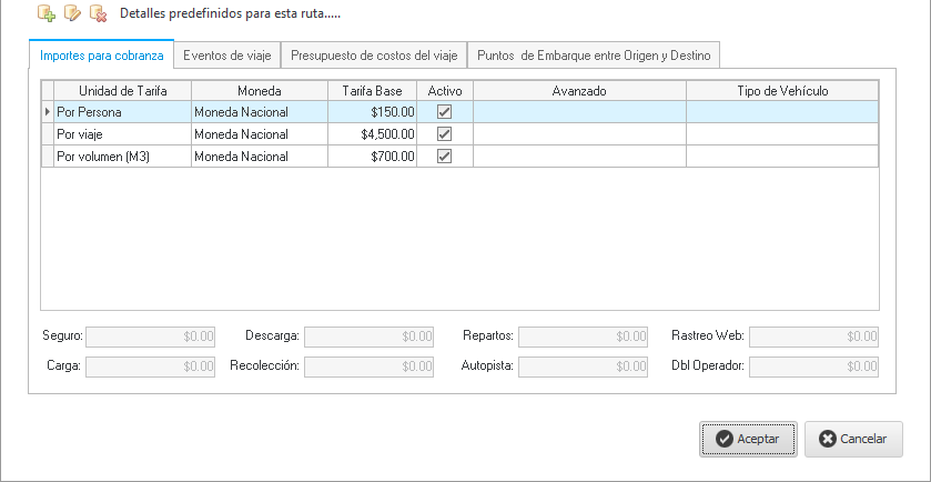 Podemos agregar costos adicionales como lo son, seguros, cargas, descargas, doble operador, rastreo, etc.