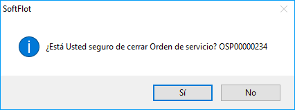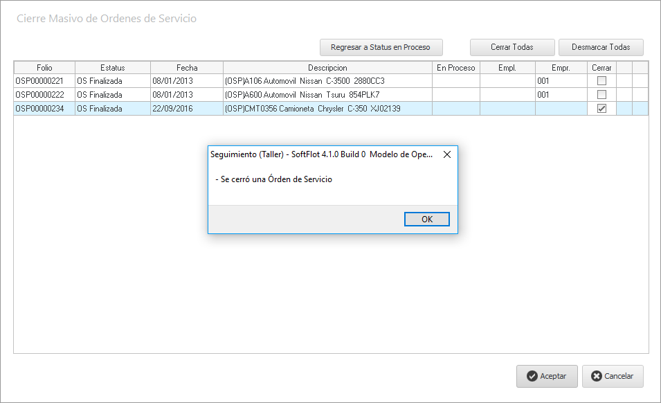 Hacemos clic en Si y nos cerrará la ventana de Actualizar; después, en la malla principal, hacemos clic en el botón para abrir la siguiente ventana en donde cerraremos por completo la OS al marcar el folio y hacer clic en Aceptar el cual nos mostrará la ventana de confirmación.