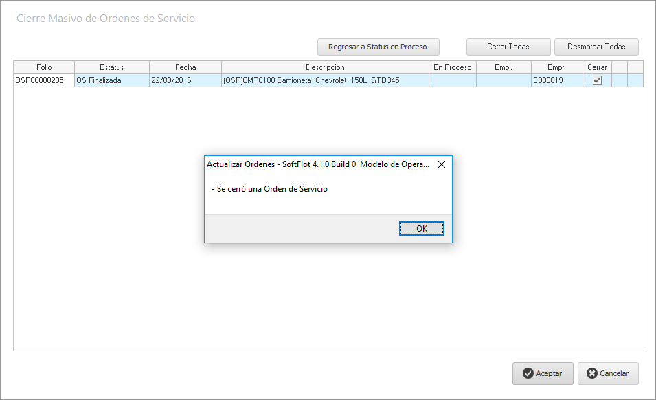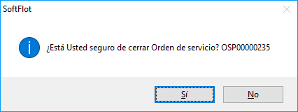 Al hacer clic, nos muestra la siguiente ventana en donde decidiremos si cerrar la OS o regresar su estatus a "En proceso" y poder modificarla nuevamente.