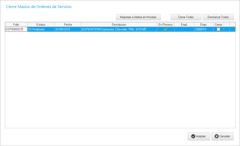 Para cerrarla, debemos de marcarla el checkbox en la parte izquierda del registro y dar clic en el botón Aceptar como se muestra en la siguiente imagen.