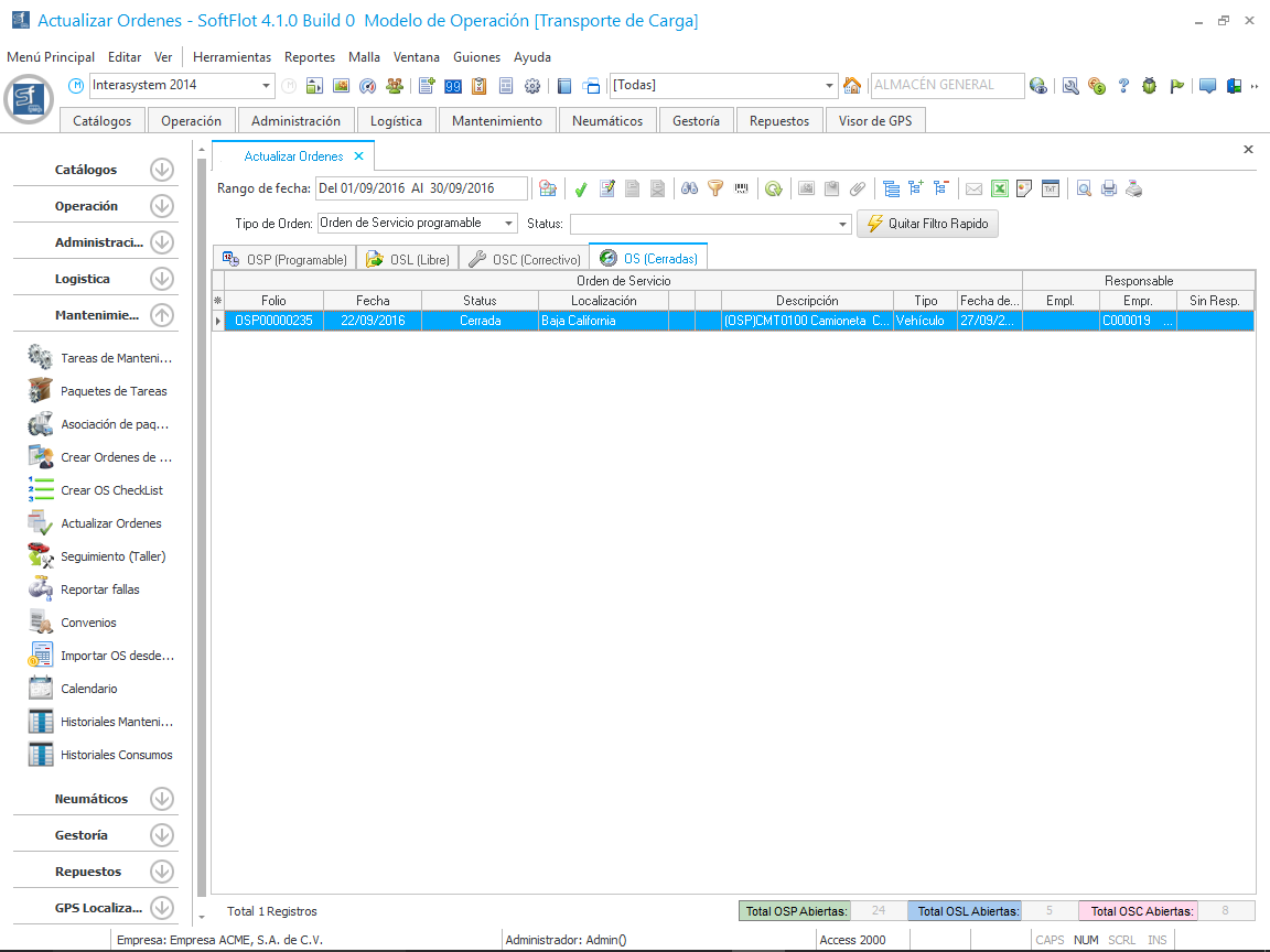 Al hacer clic en Si, cierra las ventanas y en la malla principal de datos la OS ahora tiene el estatus de OS Finalizada. Al estar en este estatus ya no podemos hacer modificación alguna pero aún no se encuentra totalmente cerrada.
