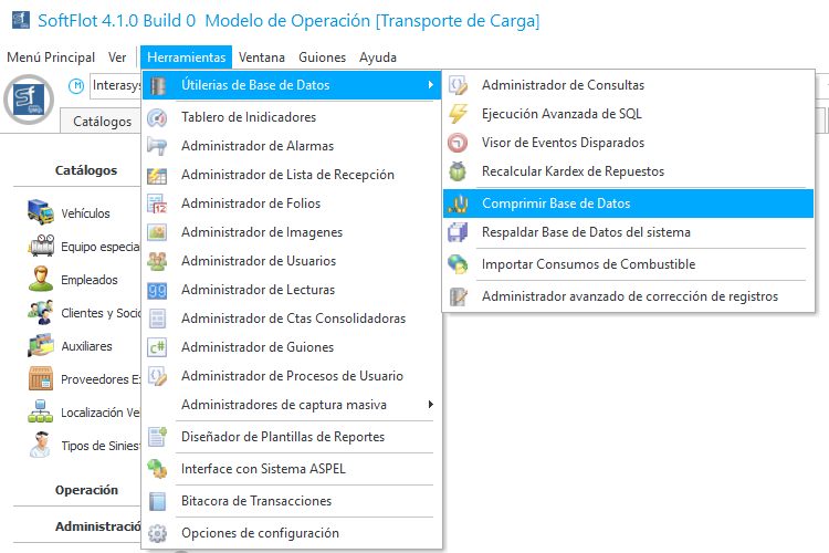Esta opción nos permite reducir el tamaño de nuestra base de datos principal, ya sea compactando la información o borrando registros que ya no son requeridos. Para abrir esta opción, debemos de ir al menú [Herramientas \ Utilerías de Base de Datos \ Comprimir Base de Datos] como se muestra a continuación.