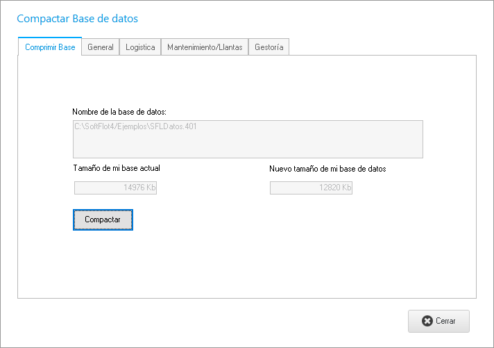 Para compactar la base, debemos seleccionar la pestaña y después hacer clic en el botón Compactar como se muestra en la siguiente ventana.