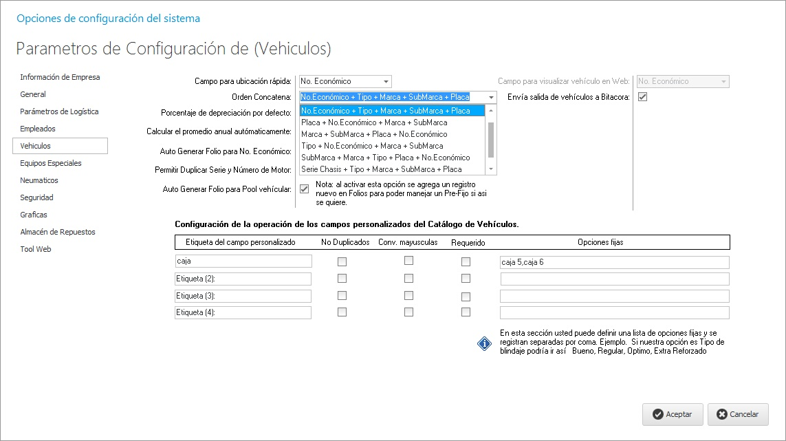 Concatenar campos seria decirle al sistema como quiero ver el nombre de mi vehículo sumando los campos de registro, esta configuración se realiza en el menú
