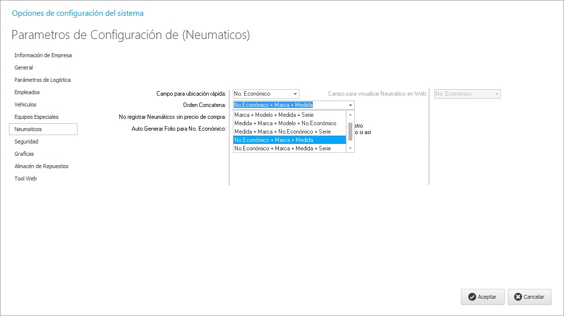 Y para los neumáticos, seleccionamos en Opciones de configuración la pestaña de Neumáticos, y en "Orden Concatena", seleccionamos el metodo para hacer la