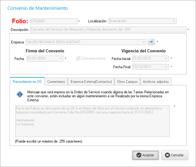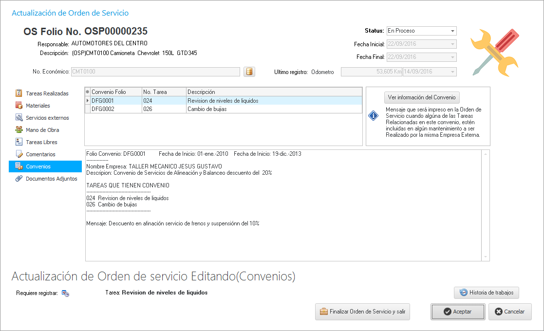 Además de poder cotizar estas reparaciones o tareas de mantenimiento en talleres externos, nos permite manejar convenios con estos talleres para la realización de ciertas tareas; para ello debemos de definirlas previamente en el módulo de Convenios y posteriormente, al hacer una OS con ciertas tareas, nos mostrará la información de estos al hacer clic en la pestaña "Convenios" como se muestra en la siguiente imagen.
