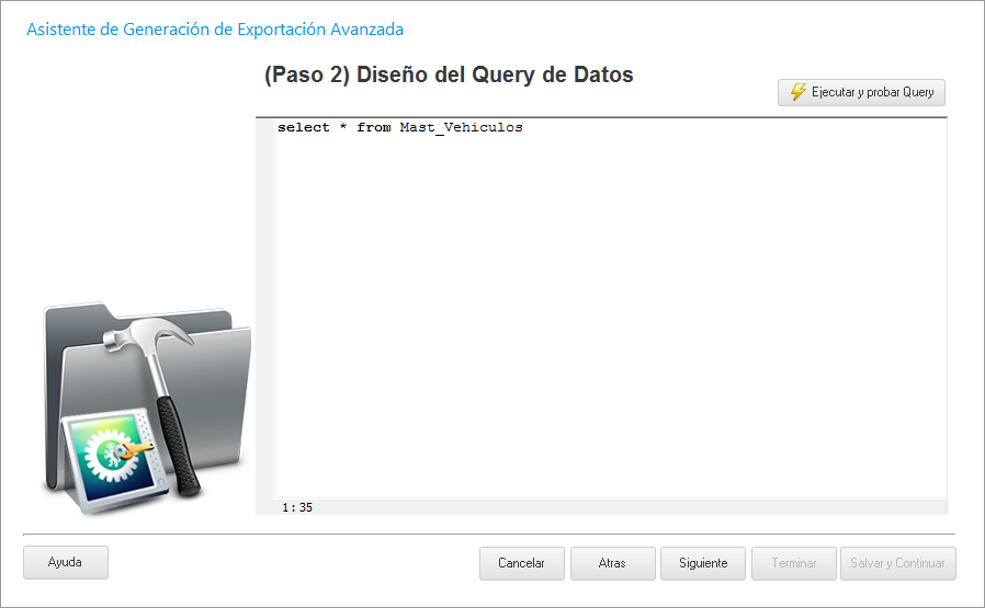 Hacemos clic en siguiente y nos muestra la ventana en donde debemos de ingresar nuestra consulta de SQL con la cual obtendremos la información que requerimos; para consultar si está correctamente estructurada, podemos hacer clic en el botón . Para el ejemplo consultaremos la tabla del Catálogo de Vehículos como se muestra en la siguiente imagen.