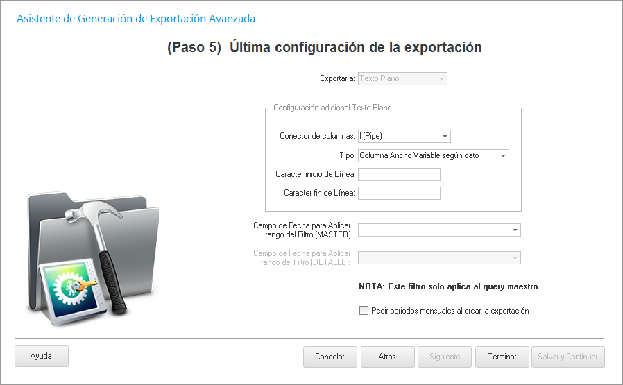 Al terminar de definir, hacemos clic en Siguiente la cual abre la última ventana en donde definimos las últimas configuraciones al archivo de Texto Plano.