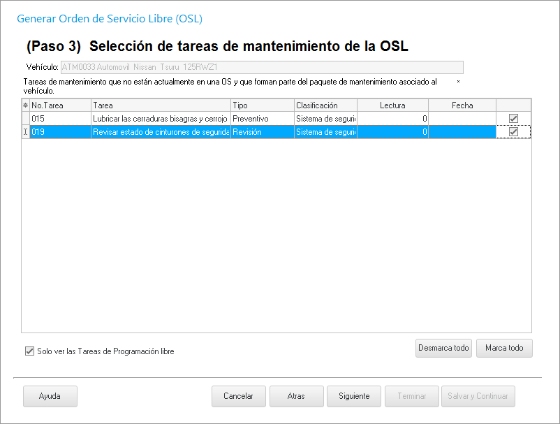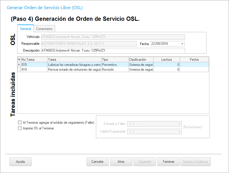 Al darle clic en Siguiente, nos muestra esta ventana en donde podemos observar el detalle de la OSL generada como las tareas de mantenimiento, la fecha cuando se generó, el responsable y el vehículo. Además, también decidiremos si enviar la OSL a ser atendida en Seguimiento (Taller) o si la enviamos a Actualizar Ordenes; además de la posibilidad de imprimir la OSL
