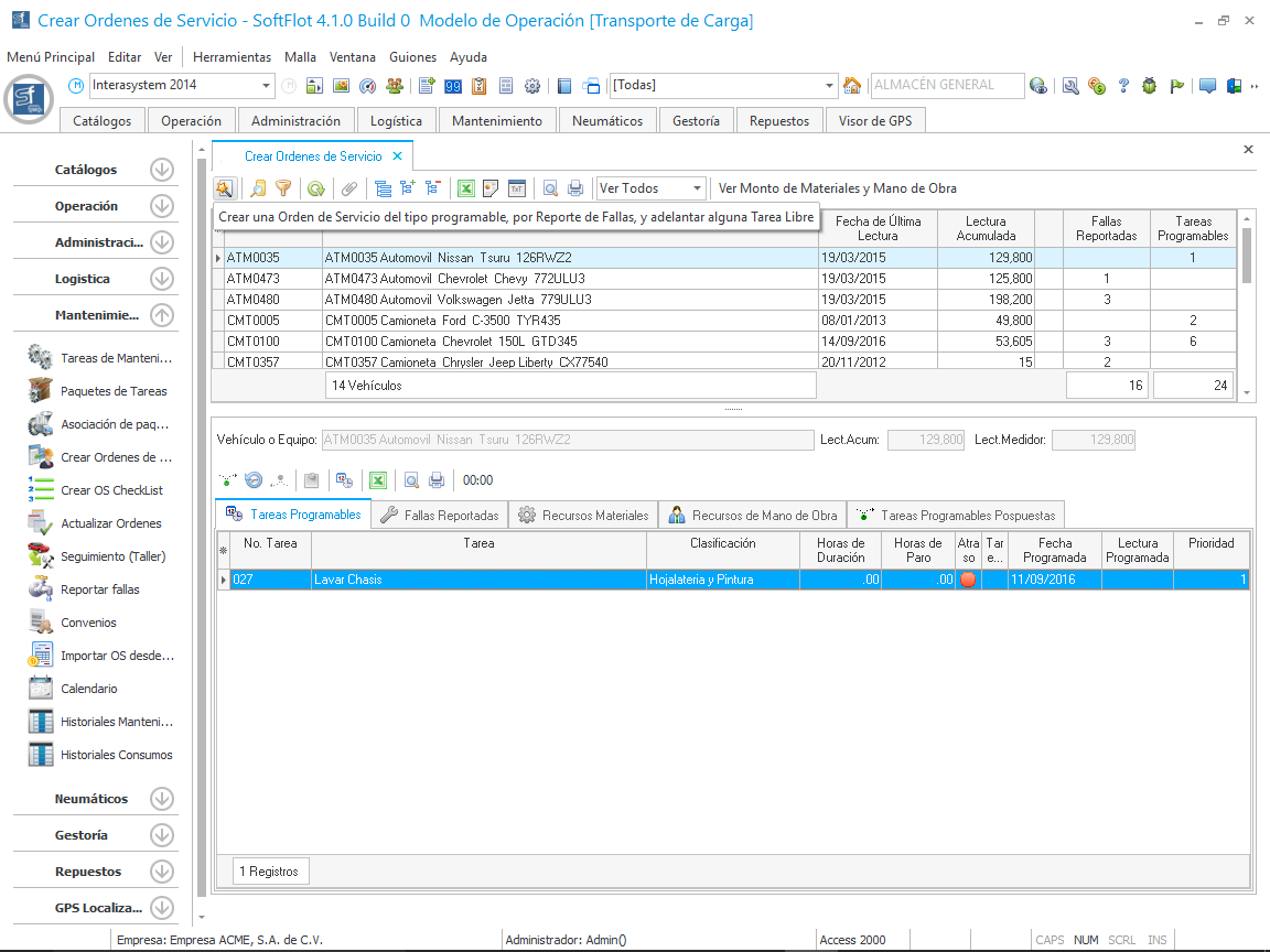 Para crear una OSP, primero se deben de cumplir las condiciones definidas en las Tareas de mantenimiento para que nos muestren los vehículos con tareas de mantenimiento pendientes en la malla principal. Para generar una OSP, debemos de dar clic en el botón