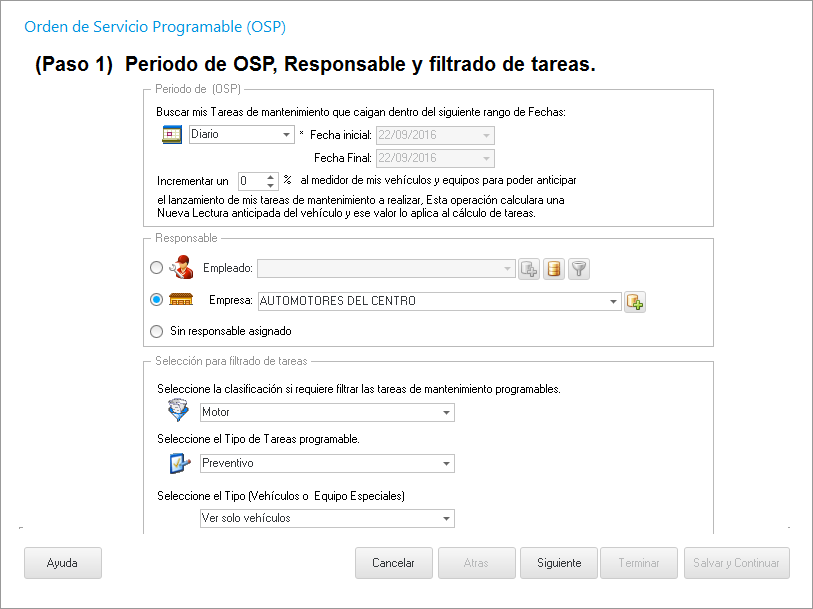 Al hacer clic en Aceptar, nos muestra la siguiente ventana en donde seleccionaremos el responsable de realizar esta o estas tareas de mantenimiento, puede ser un empleado nuestro, por parte de una empresa externa o no definir ninguno. También podemos realizar varios filtros para seleccionar únicamente los que deseamos realizar en ese momento.