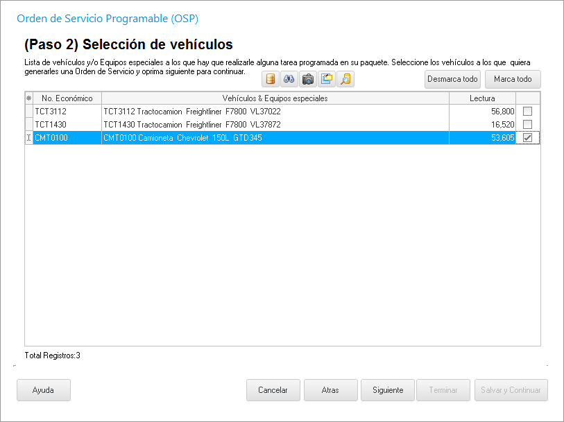 Al hacer clic en Siguiente, nos muestra la siguiente imagen en la cual podemos visualizar los vehículos o equipos que cumplan con la información seleccionada en la ventana anterior. Seleccionamos el o los vehículos o equipos a los cuales queremos generar una Orden de Servicio.