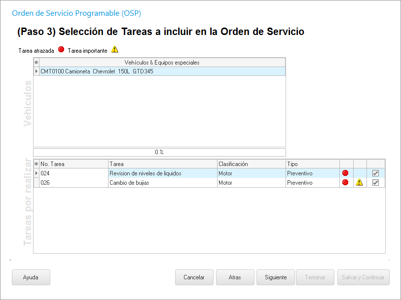 Tareas de Mantenimiento que deseamos que se realicen en esta Orden de Servicio. También nos muestra si la tarea de mantenimiento tiene un tiempo de atraso