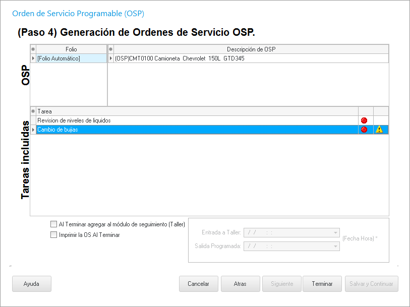 Al dar clic en Siguiente, nos muestra la última ventana en donde podremos observar los vehículos o equipos a los cuales se realizarán estas Ordenes de Servicio y las tareas que se realizarán a cada uno de ellos. En esta ventana podemos definir en que módulo se llevaría a cabo el seguimiento de sus Ordenes de Servicio: