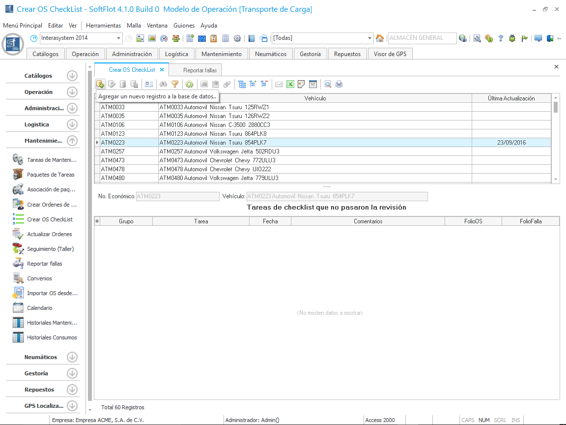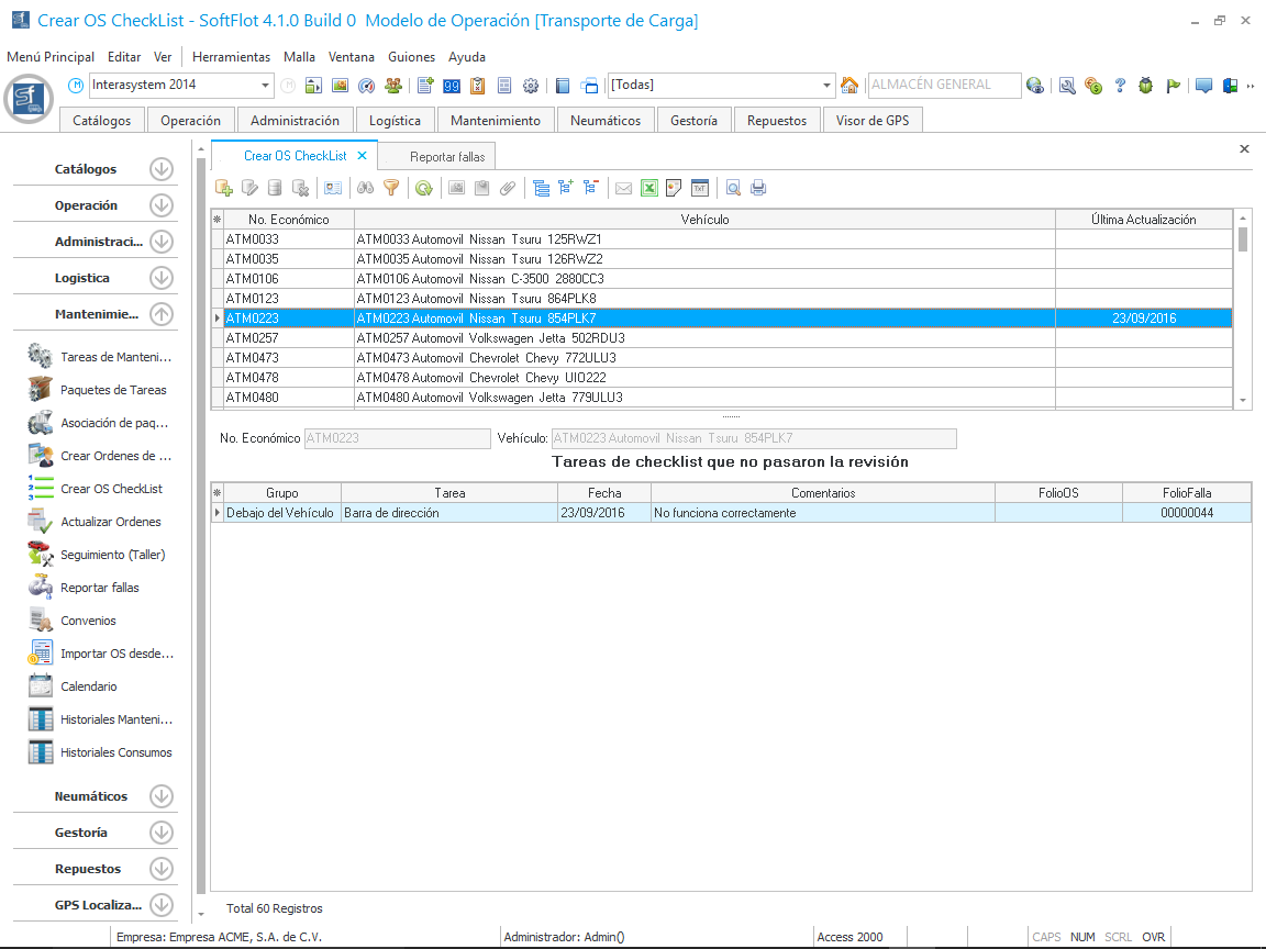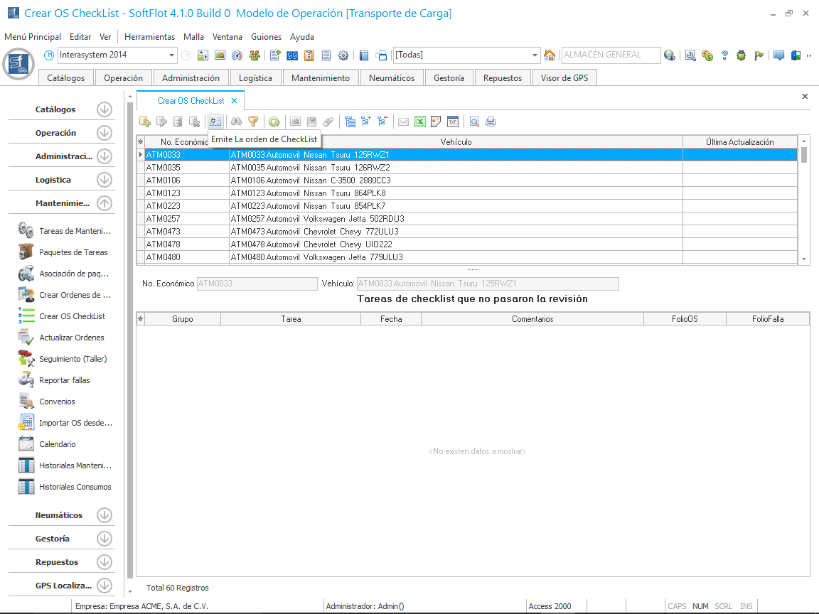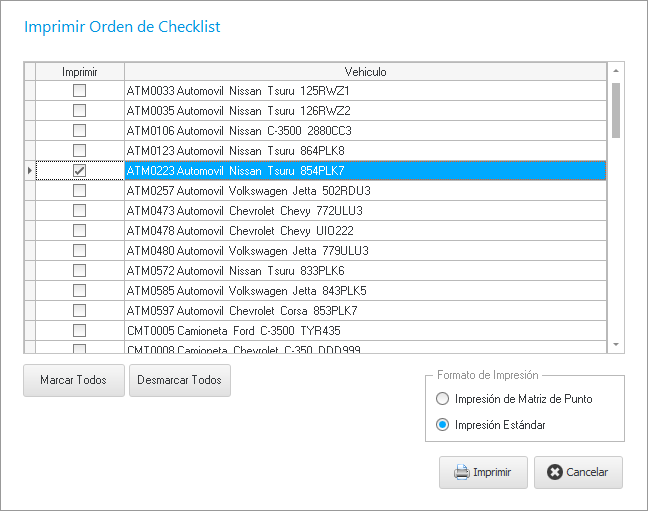 Al hacer clic nos muestra la siguiente ventana en donde podremos seleccionar uno o varios vehículos a los cuales deseamos emitir la OS de CheckList. Para el ejemplo será el vehículo con el No Económico ATM223.